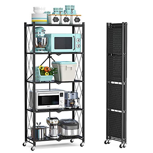 Price review 5 Shelf Foldable Storage Shelving Unit with Wheels, Metal Storage Rack Display Rack for Garage Kitchen Pantry Closet Laundry (Black)